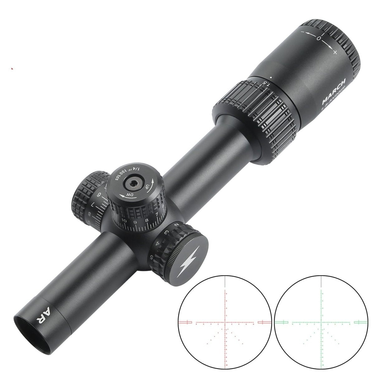 The MARCH 1.5-5X20IR delivers versatile magnification in a compact, shockproof package. With dual red/green illumination, crosshair reticle, and 20mm mounting, this scope excels in close to mid-range applications where speed and precision both matter.