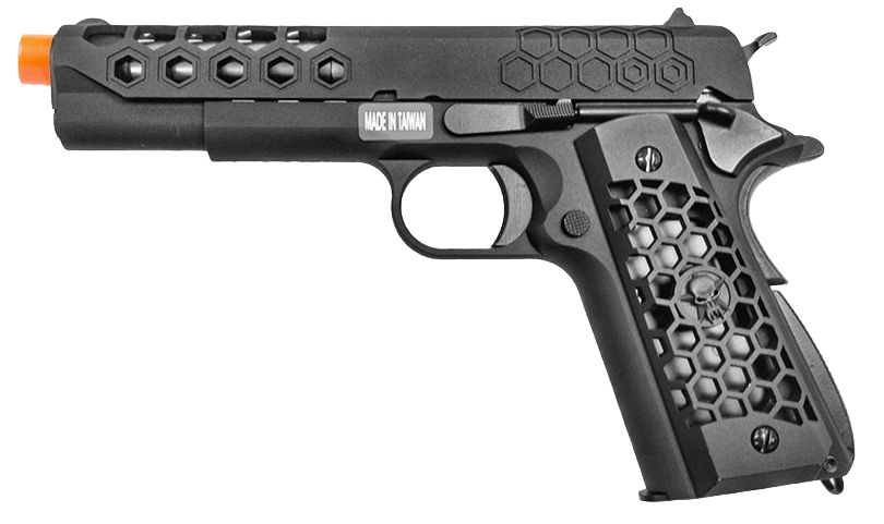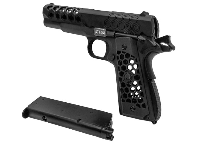 Experience classic 1911 styling with modern performance in the WE Tech 1911 Hex Cut GBB. Featuring full metal construction, distinctive hex-cut slide design, and realistic gas blowback action, this premium pistol delivers 280-300 FPS velocity with iconic handling.